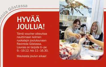 Ilahduta henkilökuntaa, ystäviä tai sukulaisia hyvillä mauilla! Tilaa Ravintola Göstan joululounasvouchereita ja sisällytä pakettiin halutessasi liput myös Serlachiuksen näyttelyihin ja Taidesaunan yleisövuoroille. Museo- ja saunaliput ovat voimassa vuoden 2026 loppuun.