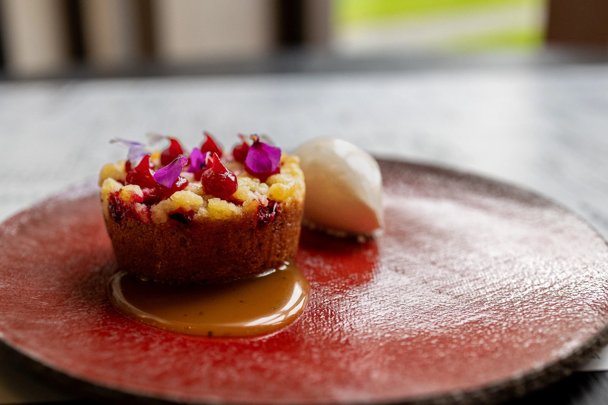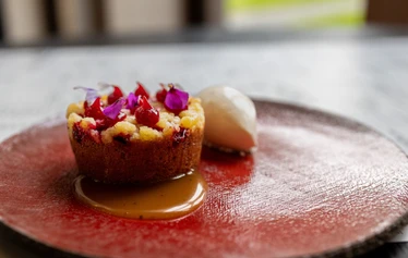 Creme brulee, valkosuklaata ja vadelmasorbettia
